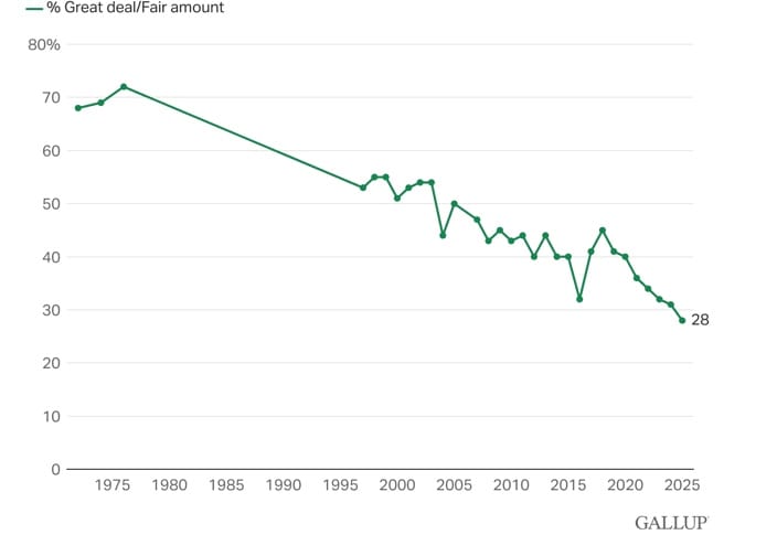 Twenty-eight percent of Americans in 2025 say they trust the mass media “a great deal” or “a fair amount.” This is the lowest in Gallup's trend following several years of gradual decline. A combined 70% express limited or no trust in the media, with 34% reporting “none at all.”