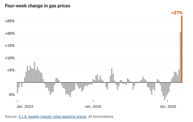 The average price of gasoline in the United States has climbed by nearly a dollar since the start of the war in Iran, rising from around $2.90 per gallon in mid-February to $3.70 by mid-March, according to the Energy Information Administration. The increase marks the second-largest four-week spike in at least 30 years, exceeding the price jumps at the start of the war in Ukraine in 2022, the post-recession oil surge of 2009 and the OPEC production cuts of 1999.