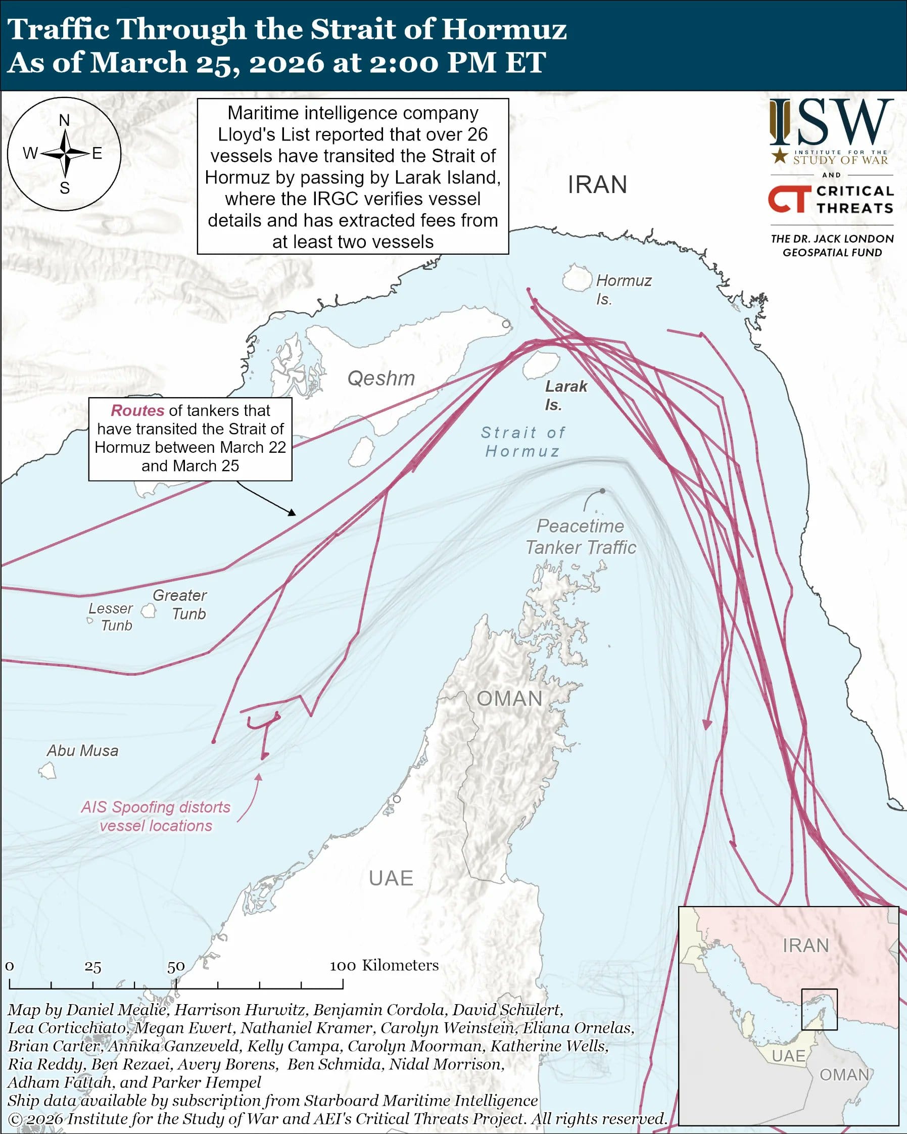 Iran sent a letter to International Maritime Organization member states on March 22 declaring that non-hostile ships may pass through the Strait of Hormuz if they coordinate with Tehran, according to the Financial Times. Ships associated with the United States, Israel or other participants in the conflict are excluded from safe passage. At least 26 vessels have taken an Iranian-approved route passing by Larak Island as of March 25, where the Islamic Revolutionary Guard Corps verifies vessel details and has extracted fees from at least two ships. Maritime intelligence firm Lloyd's List reported that vessel operators must contact intermediaries with IRGC connections before transiting. Current traffic in the strait is dominated by Iranian vessels at 67 percent, followed by Greek ships at 15 percent and Chinese vessels at 10 percent.