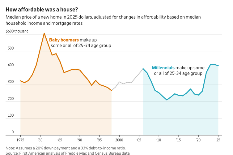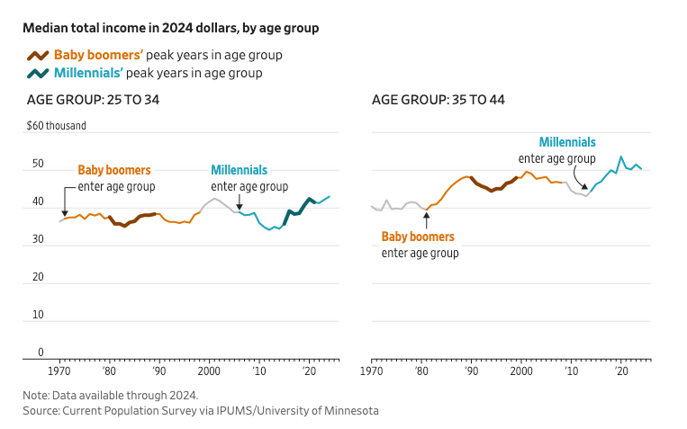 A comparison of key financial data points between millennials and baby boomers at similar ages shows the two generations are more evenly matched than popular narratives suggest. Median incomes for millennials in early adulthood were roughly on par with boomers', and wage gains over the past decade have improved their relative standing. Home affordability has been difficult for millennials in the mid-2020s, but boomers faced mortgage rates above 18% in the early 1980s. The clear exception is higher education: college costs surged for millennials, leaving them with substantially larger student debt loads that slowed wealth accumulation. Economist Constantine Yannelis of the University of Cambridge noted that degree holders still earned a pay premium that offset much of the cost over time.