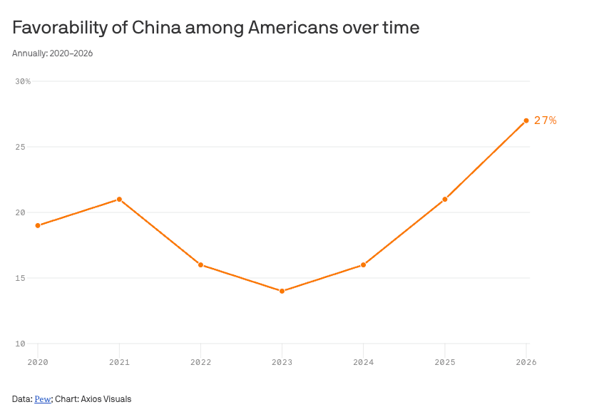 American views of China have grown more favorable for the third consecutive year, according to an annual Pew Research Center survey conducted in March. Twenty-seven percent of Americans now hold a favorable view of China, up 6 points from last year and nearly double the 14% recorded at a 2023 low. The share who describe China as an "enemy" has fallen to 28%, down from 33% in 2025, while 60% now call it a competitor. The shift marks a softening of the bipartisan distrust of Beijing that hardened during President Trump's first term.