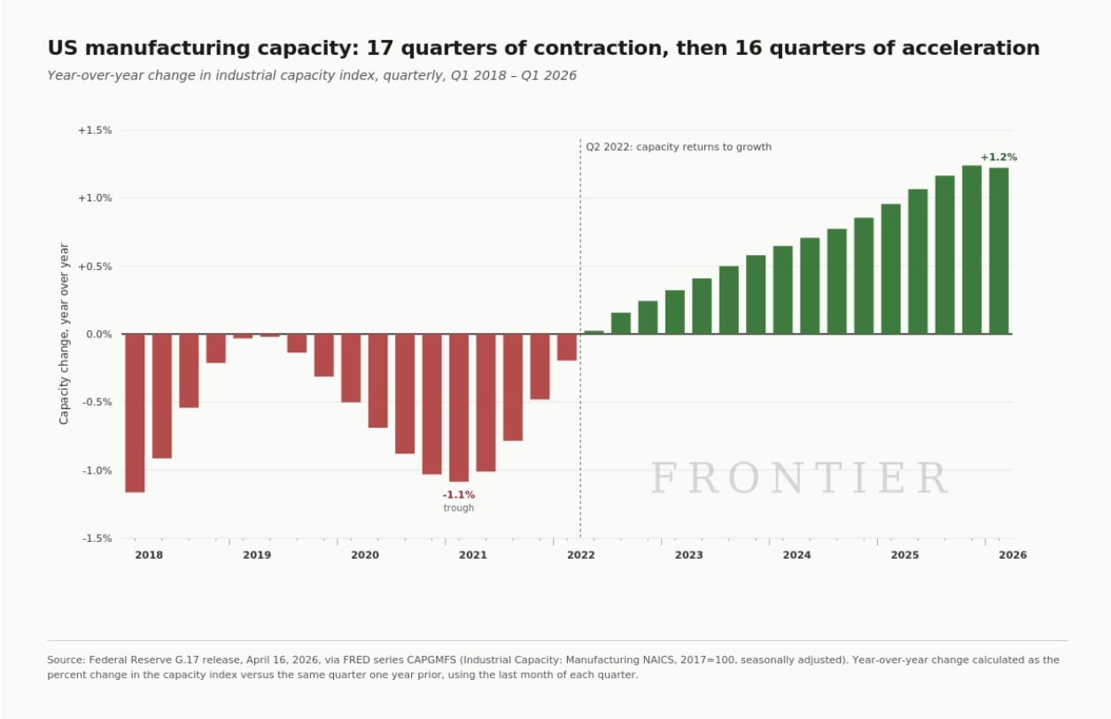 Behind the numbers is the artificial intelligence buildout, which requires hundreds of billions of dollars in semiconductors, networking equipment, power generation, and cooling systems, some made domestically and much of it imported. U.S. manufacturing capacity has now expanded for 16 consecutive quarters, the first sustained expansion in nearly two decades. Sectors leading the growth feed back into production itself, including business equipment, up 4.6% year-over-year, along with machinery, electrical equipment, fabricated metal, and computer and electronic products. Credit for the recovery appears to belong to demand rather than trade policy, with the U.S. positioned to supply goods the market currently wants.