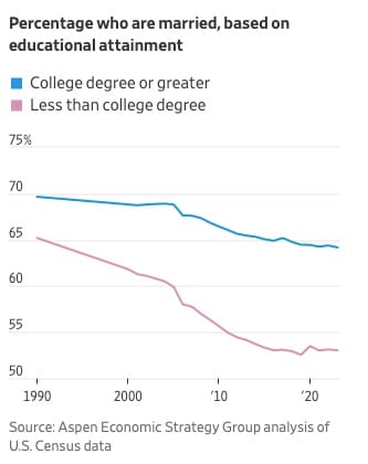 The estimated median age for a first marriage as of last year was 30 for men and 29 for women, according to the most recent census data, up from 28 for men and 26 for women in 2008. The recent engagement of Taylor Swift and Travis Kelce, both in their mid-30s and perhaps at the apex of their careers, is the ultimate capstone model. The problem, researchers say, is that a capstone view of marriage raises the bar for what people think their lives need to look like before they wed. “If the white picket-fence home and the beautiful wedding in the Virginia countryside is out of reach for you,” Wilcox said, “then you are just never going to get married, because you think ‘marriage isn’t for me.’ ” Still, researchers say, people waiting longer to get married and being more selective about whom they pair off with can result in more stable marriages, contributing to a reduction in the divorce rate. The marriage rate, that is the rate of new marriages to the overall population, has been on a long downward trajectory, census data shows. Between 2008 and 2023, the first-marriage rate among 22- to 45-year-olds declined 9%, to 60 marriages per 1,000 never-married Americans, according to an analysis by Bowling Green State University’s National Center for Marriage & Family Research.