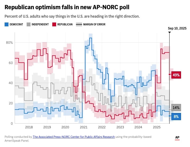 DES MOINES, Iowa (AP) — Republicans’ outlook on the direction of the country has soured dramatically, according to a new AP-NORC poll that was conducted shortly after last week’s assassination of conservative activist Charlie Kirk. The share of Republicans who see the country headed in the right direction has fallen sharply in recent months, according to the September survey by The Associated Press-NORC Center for Public Affairs Research. Today, only about half in the GOP see the nation on the right course, down from 70% in June. The shift is even more glaring among Republican women and the party’s under-45 crowd. Overall, about one-quarter of Americans say things in the country are headed in the right direction, down from about 4 in 10 in June. Democrats and independents didn’t shift meaningfully.