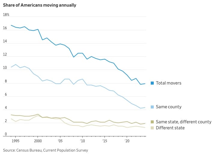 In the 1950s and ’60s, some 20% of Americans would typically move each year. The share of people moving has steadily slowed since then, in part because the U.S. population has aged, and older people tend to move less. By 2019, the year before the Covid pandemic, 9.8% of Americans moved. During Covid, there was a well-publicized increase in people decamping farther away from work and deeper into the suburbs. That surge was brief. In 2023, only 7.8% of Americans moved, the lowest rate logged since U.S. Census records began in 1948. That figure held relatively steady in 2024, the most recent data available. For much of the 2010s, a median-income family who bought a median-priced home spent 30% or less of their earnings on housing costs, according to brokerage Redfin. That share is now 39%. Last year, home sales fell to the lowest level in almost 30 years. John Burns Research and Consulting estimates the share of U.S. households moving to a different metro area has fallen by 29% since 2021.