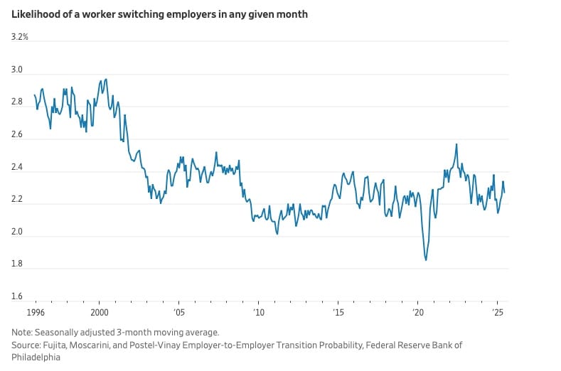 A measure of hiring, quits and layoff activity in a range of mostly white-collar industries—the number of people being hired or leaving their jobs divided by the size of the workforce—fell last year to its lowest level since 2009. The share of people switching jobs declined between the 1980s and the 2010s, according to an analysis of census data by Minneapolis Fed economist Abigail Wozniak and colleagues. In the late 1990s, the probability that a worker would switch employers in any month averaged around 2.8%, according to data from the Philadelphia Fed. That is down to an average of 2.3% in the 2020s so far. Recent college graduates who are underemployed are more than three times as likely to be underemployed a decade later than those who quickly secure a good job, a recent study by the Burning Glass Institute found. Part of the long-term nationwide decline in mobility is because more women work full-time and they earn more money than before, said John Jones, an economist at the Richmond Fed. Rising expenses have made a dual-income household more of a necessity for many families. Couples where both people work had the lowest levels of interstate mobility of any group in an analysis by Jones.
