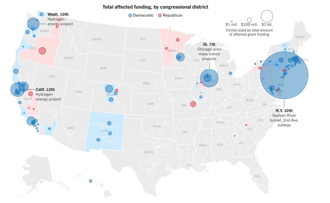 Two weeks into the government shutdown, the Trump administration has frozen or canceled nearly $28 billion that had been reserved for more than 200 projects primarily located in Democratic-led cities, congressional districts and states, according to an analysis by The New York Times. Each of these infrastructure projects had received federal aid, sometimes after officials spent years pleading in Washington — only to see that money halted as President Trump has looked to punish Democrats over the course of the fiscal stalemate. The Times conducted its analysis by examining federal funding records, which include details about the city and state where each grant recipient is based. The projects include new investments in clean energy, upgrades to the electric grid and fixes to the nation’s transportation infrastructure, primarily in Democratic strongholds, such as New York and California.