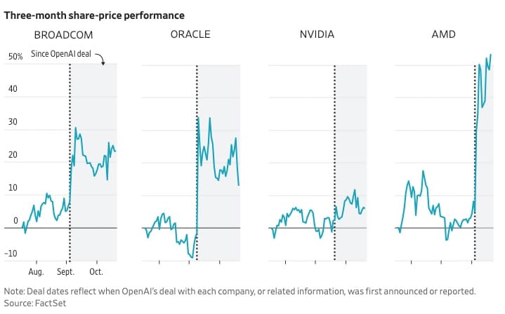 To achieve his vision of securing seemingly endless computing power for OpenAI, Altman has gone on a dealmaking blitz, playing the egos of Silicon Valley’s giants off one another as they race to cash in on OpenAI’s future growth. The resulting game of financial one-upmanship has tied the fates of the world’s biggest semiconductor and cloud companies—and vast swaths of the U.S. economy—to OpenAI, essentially making it too big to fail. All of them are now betting on the success of a startup that is nowhere near turning a profit and facing a mounting list of business challenges. Investors aren’t bothered. On four separate days over the past two months, the stock prices of Oracle, Nvidia, Advanced Micro Devices, and Broadcom soared after they disclosed OpenAI-related deals—adding a combined $630 billion to their market value in the first day of trading after the announcements. A broader rally in tech stocks followed each time, helping lift the U.S. stock market to record highs.