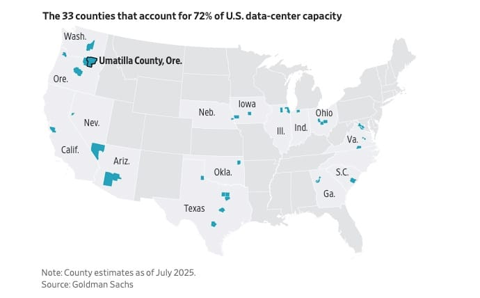 UMATILLA, ORE.—Yesenia Leon-Tejeda, like many people on the frontier of America’s tech boom, is basking in newfound prosperity. Her hometown in northeast Oregon was not long ago known for a former chemical-weapons depot nearby, a state prison on the city’s outskirts and the strip clubs once dotting its main drag. But a growing fleet of Amazon data centers has turned the region around Umatilla into an unlikely nerve center for one of the most expensive infrastructure build-outs in U.S. history. The tech giant has pumped jobs, people and money into the community of roughly 8,000, doubling many home prices and enticing builders to etch new neighborhoods into surrounding hillsides. That means dollar signs for Realtors like Leon-Tejeda. The daughter of Mexican-born farmhands, Leon-Tejeda worked 12-hour shifts at a distribution center before qualifying for a real-estate license. Now, she is on pace to close 35 deals this year. The 35-year-old aims to raise her kids in a soon-to-be-built house overlooking the Columbia River and has her eye on Airbnb investments to cash in on the region’s growth. America’s tech build-out has minted millionaires in Silicon Valley, helped a record-breaking stock market defy gravity and buoyed an otherwise uncertain U.S. economy. Investment in software and information-processing equipment drove most of America’s GDP growth in the first half of 2025, according to federal data. The top five tech giants—known as hyperscalers in the data-center world—total more than a third of all S&P 500 capital expenditures. Companies are throwing money at digital innovation to become more profitable with fewer workers down the road. But the sheer scale of investment has obscured how it is already reshaping America, in the form of windowless buildings the size of multiple football fields where businesses store and process information. That development is injecting vast sums of cash into sometimes unexpected corners of the country—many of them bypassed by previous boomtimes. The avalanche of money, which most recent federal data put at $41 billion in annual investment, isn’t spread evenly. Goldman Sachs estimated roughly 72% of all server-farm capacity sat in just 1% of counties as of July.