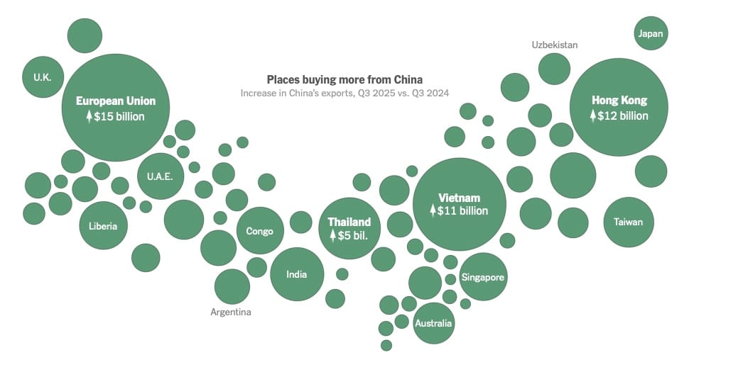 As President Trump has imposed steep tariffs on China, American importers are buying much less. But the rest of the world is making up the difference, buying more from China than ever. China has offset the decline from America with breathtaking speed. Shipments to other parts of the world have surged this year, demonstrating that China’s manufacturing dominance will not be easily slowed. Chinese exports are on track to reach another record this year. That’s because China was prepared. It has been seeking out new customers for years, and its massive manufacturing investment allows it to sell goods at low prices. The rest of the world is caught between the two superpowers. Some countries, including Vietnam 28% and members of the European Union 11%, are deeply concerned about the risk posed by China’s exports to their own industries, and China faces a backlash in the form of tariffs in regions like Europe. Other nations, like Argentina 57% and Nigeria 45%, are buying low-cost Chinese technology to modernize their economies but running up wider trade imbalances with China. For years, Americans have turned to China to outfit their homes and stock their offices. While the volume of Chinese exports remains enormous, the declines this year are widespread and drastic. The United States is buying less of almost everything from China
