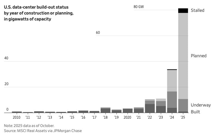 Here’s a way to evaluate the riskiness of the world’s collective investment in artificial intelligence: Can we even build all the necessary physical infrastructure? And if so, will the resulting AI-powered products generate enough revenue to pay back that investment? The rate at which tech companies and startups are investing in AI shows no signs of slowing. In their latest financial reports, all of the big spenders revealed that their current investments had grown significantly, and projected that this trend would continue. All this investment has translated into record spending on the stuff that goes into data centers—aka “AI supercomputers”—all those chips, servers, HVAC systems, transformers, gas turbines, power lines and power plants. There are absolute, physical limits to how quickly all of that can be delivered. As a result, some projects are already being delayed. There are huge numbers of AI data centers in the planning stage, which means developers are in the process of securing land and getting permits, says Steve Tusa, a managing director at JPMorgan Chase. Today’s record number of data centers at the planning stage is indicative of what Raymond James managing director Frank Louthan calls “kind of a gold rush mentality.” Connecting these planned data centers to power and fiber, and finding a buyer or tenant who wants one, in that particular location is another matter.