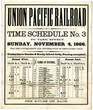 The need for continental time zones stemmed directly from the problems of moving passengers and freight over the thousands of miles of rail line that covered North America by the 1880s. Since human beings had first begun keeping track of time, they set their clocks to the local movement of the sun. Even as late as the 1880s, most towns in the U.S. had their own local time, generally based on “high noon,” or the time when the sun was at its highest point in the sky. As railroads began to shrink the travel time between cities from days or months to mere hours, however, these local times became a scheduling nightmare. Railroad timetables in major cities listed dozens of different arrival and departure times for the same train, each linked to a different local time zone.