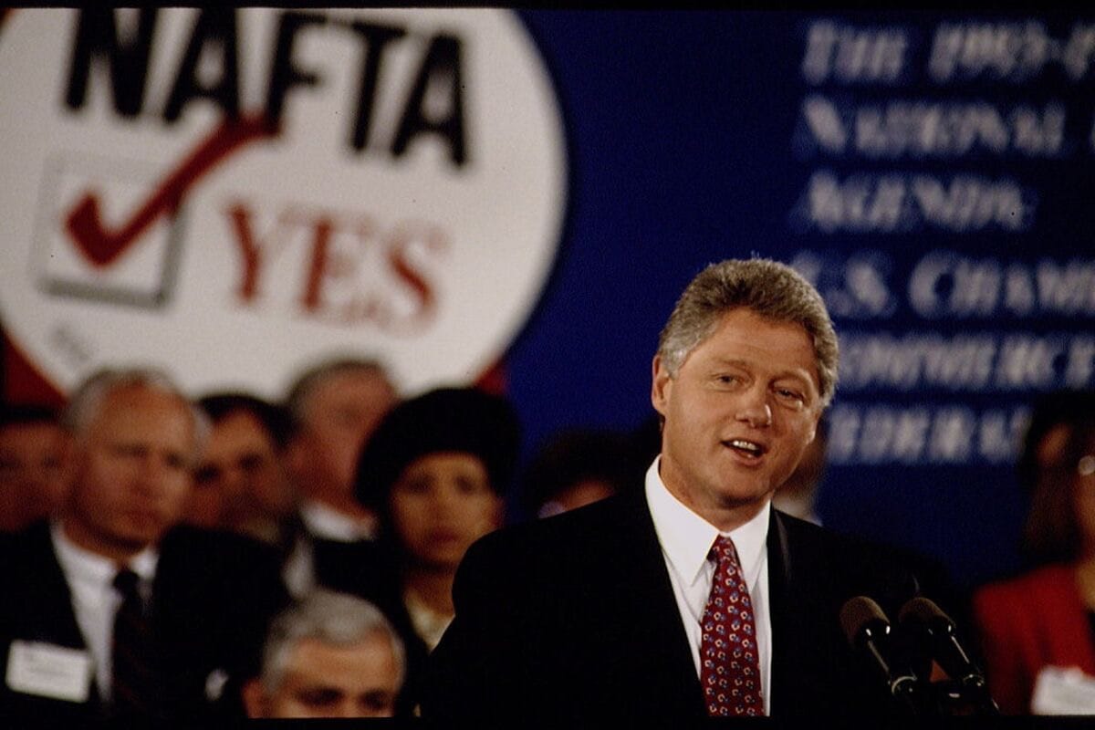 NAFTA’s passage in 1993 became a powerful symbol of the broader turn toward globalized, rules-based trade that had already been encouraging U.S. firms to shift production overseas. The agreement reduced tariffs and investment barriers across North America, making it easier and cheaper for companies to move factories to Mexico while still selling into the U.S. market. Critics like Ross Perot warned of a “giant sucking sound” as jobs left industrial communities, and over time plant closures, wage pressure, and job insecurity in many manufacturing regions reinforced a perception that political and business elites had prioritized efficiency and corporate profits over the stability of blue-collar workforces. In this narrative, NAFTA became shorthand for a wider pattern of offshoring and deindustrialization rather than a standalone policy choice.