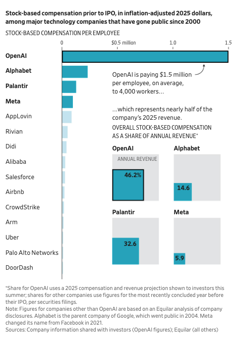 OpenAI is providing employees with stock-based compensation averaging $1.5 million per person across its roughly 4,000-member workforce, according to financial data shown to investors. The compensation level exceeds any major tech startup in recent history, reaching more than seven times the stock-based pay Google disclosed in 2003 before its 2004 initial public offering. A Wall Street Journal analysis of data compiled by Equilar found OpenAI's average employee compensation is approximately 34 times higher than the average among 18 other large tech companies in the year before they went public, based on a review of major technology IPOs over the past 25 years.