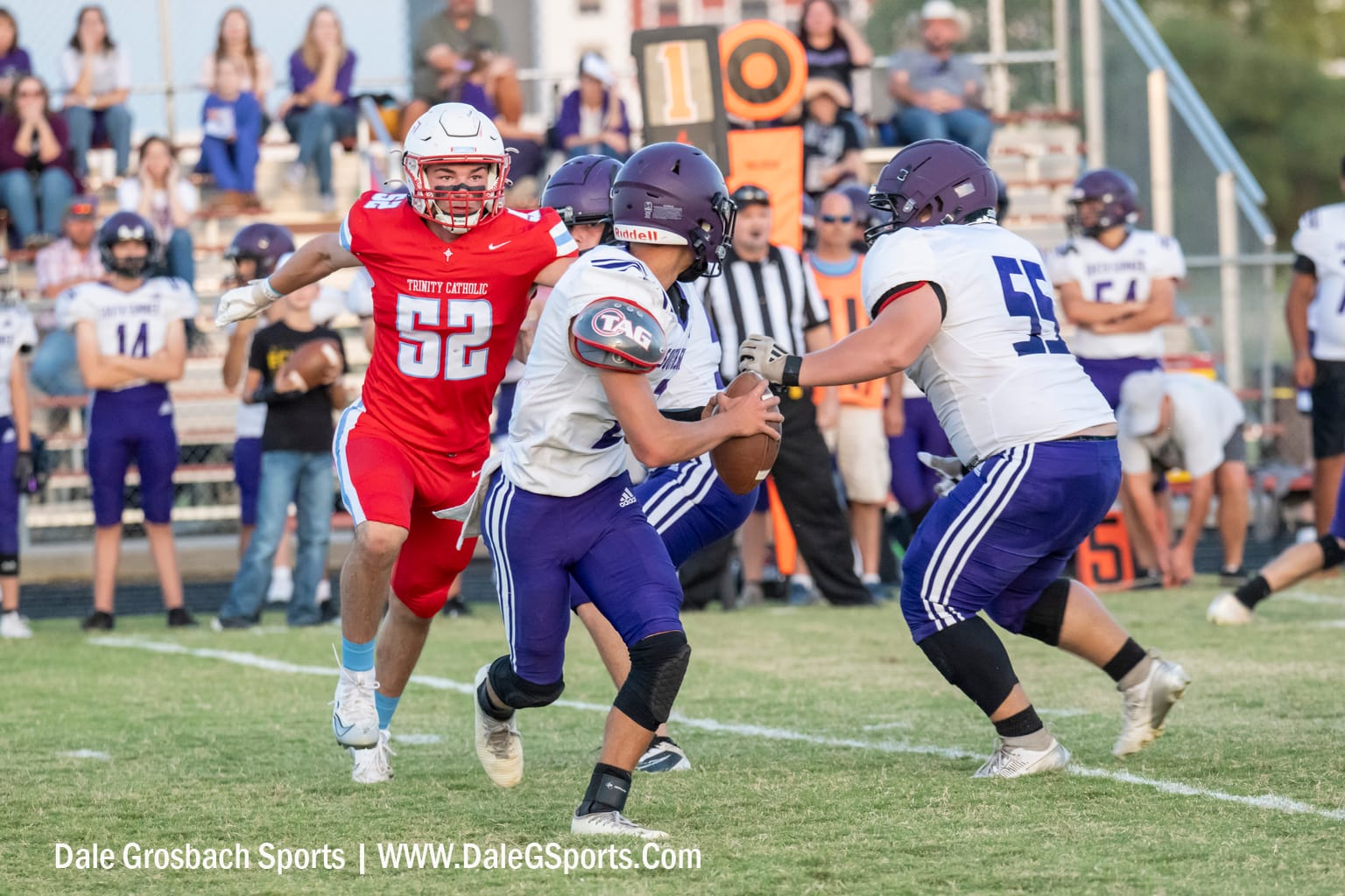 Trinity Catholic senior defender Gage Schroder (52) pressures South Sumner junior quarterback Mak Blosser (2). The Hutchinson Trinity Catholic High School Celtics defeated the South Sumner Outlaws 48-7 on Sept. 26, 2025.