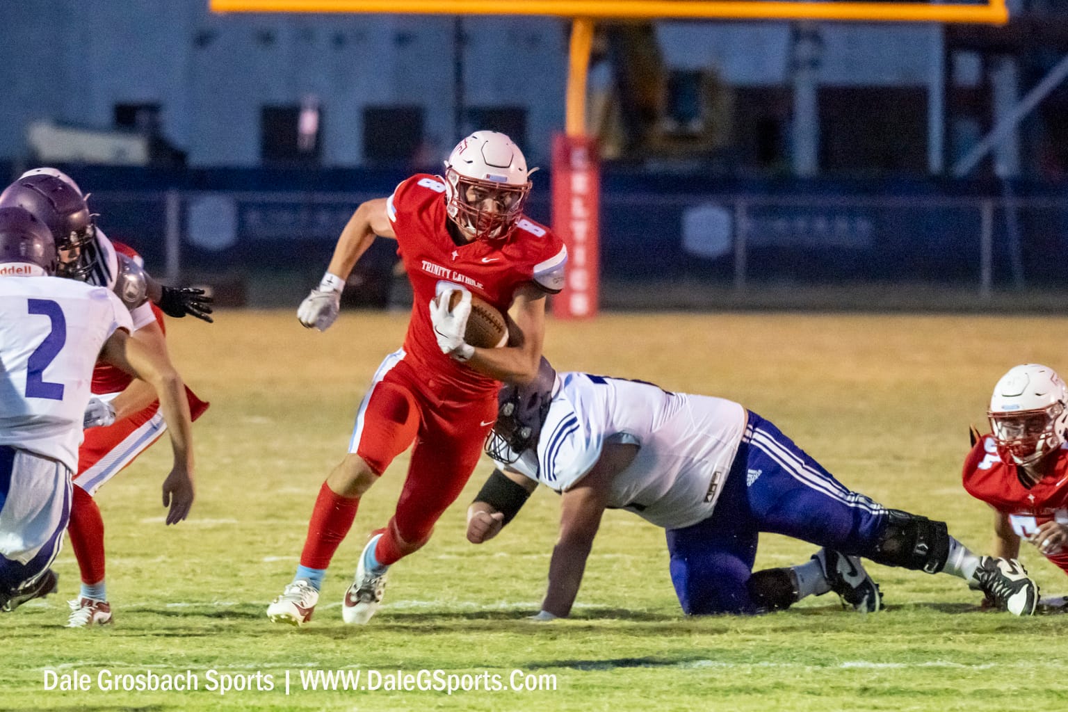 Trinity Catholic senior running back Luke Kerns (8) powers through the hole against the South Sumner Outlaws.