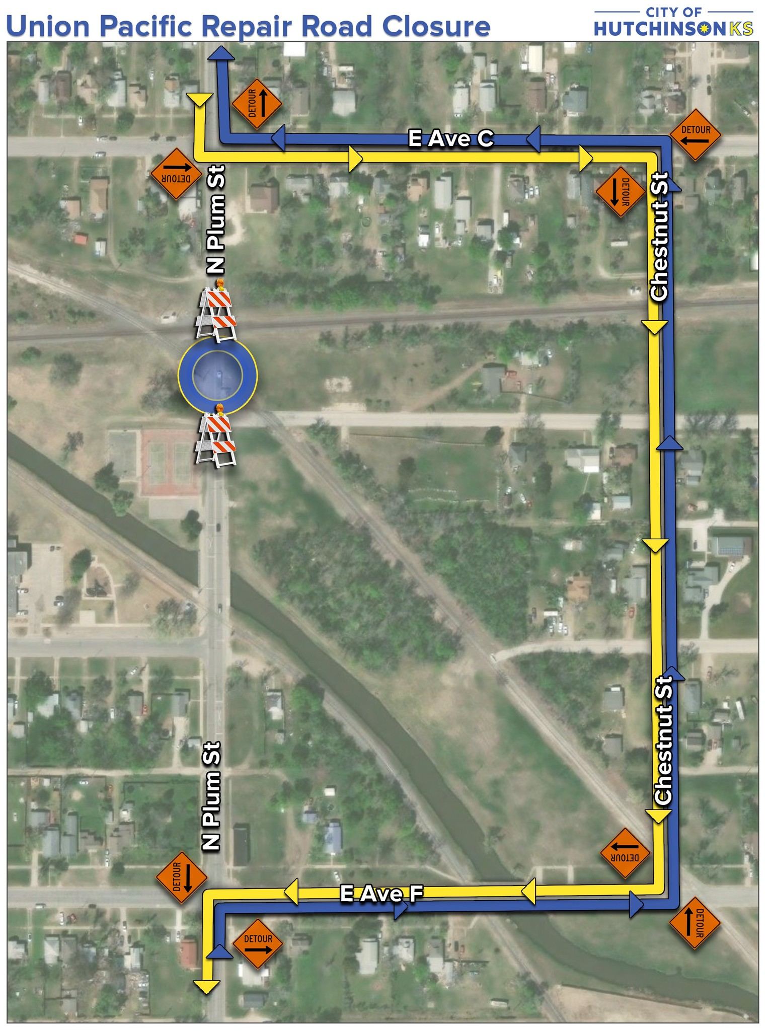 A second, larger round of closures is scheduled for April 14-15 and will affect four crossings simultaneously — Cleveland Street, Chestnut Street, Plum Street and Maple Street, all located just north of Avenue D. Detour routes for those closures have not yet been finalized, according to the City of Hutchinson.