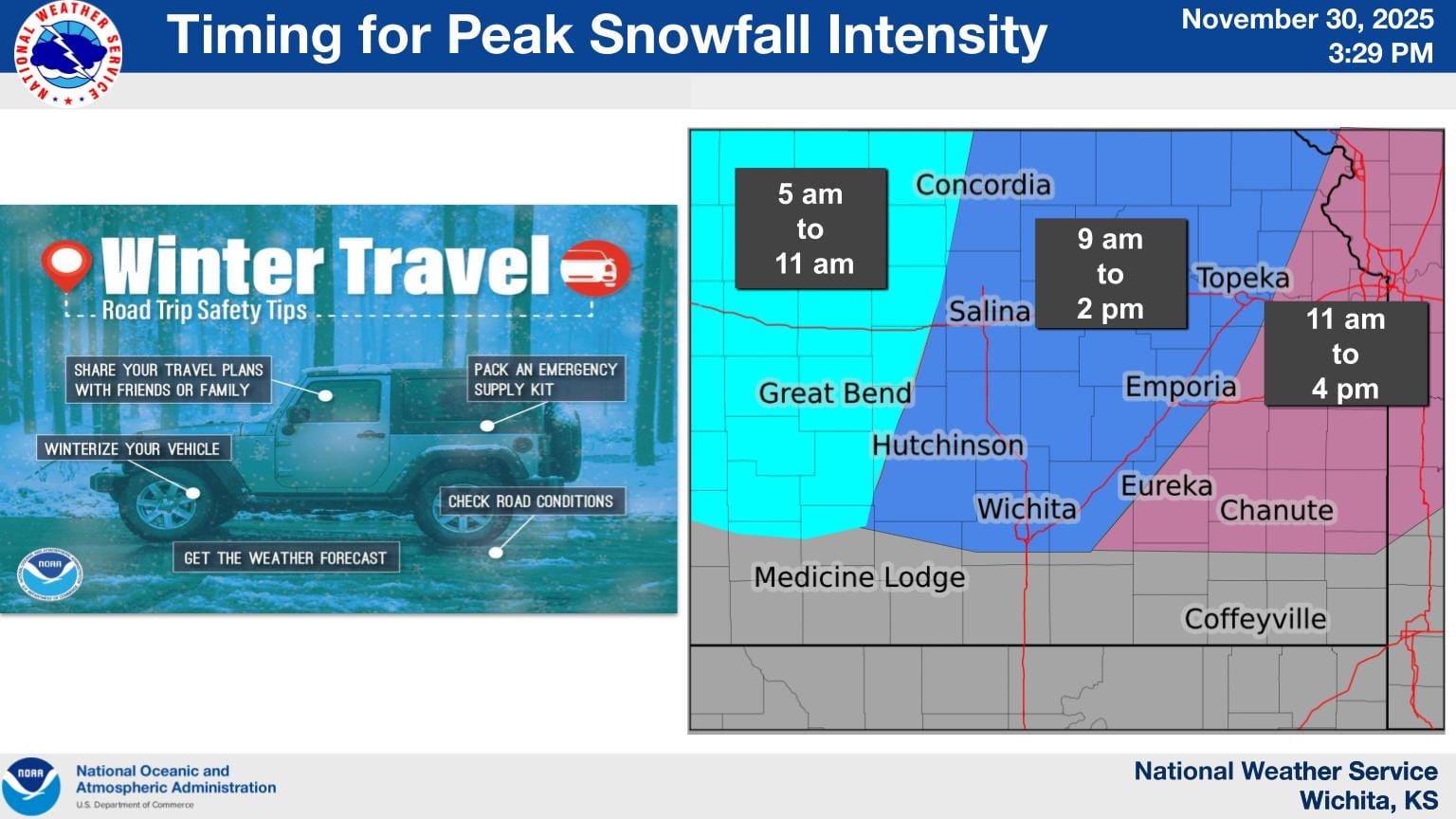MCPHERSON, Kan. — The National Weather Service has issued a Winter Weather Advisory for McPherson and surrounding areas from 3 a.m. to 6 p.m. Monday, with snow accumulations of 2 to 4 inches expected across central Kansas. The advisory covers McPherson, Salina, Hutchinson, Newton, and several other communities in the region, with forecasters warning that slippery road conditions could significantly impact both Monday morning and evening commutes. Residents are advised to slow down and use caution while traveling, and motorists can obtain the latest road conditions by calling 511. The winter weather system is expected to move through the area during the 15-hour advisory period, creating hazardous driving conditions throughout much of the day.
